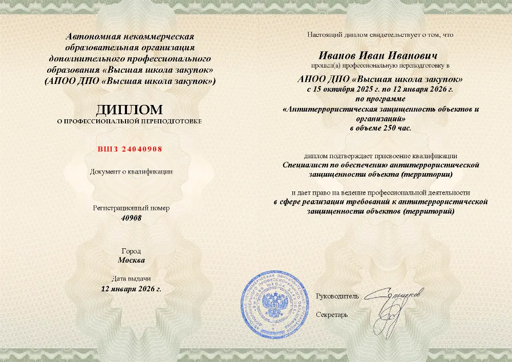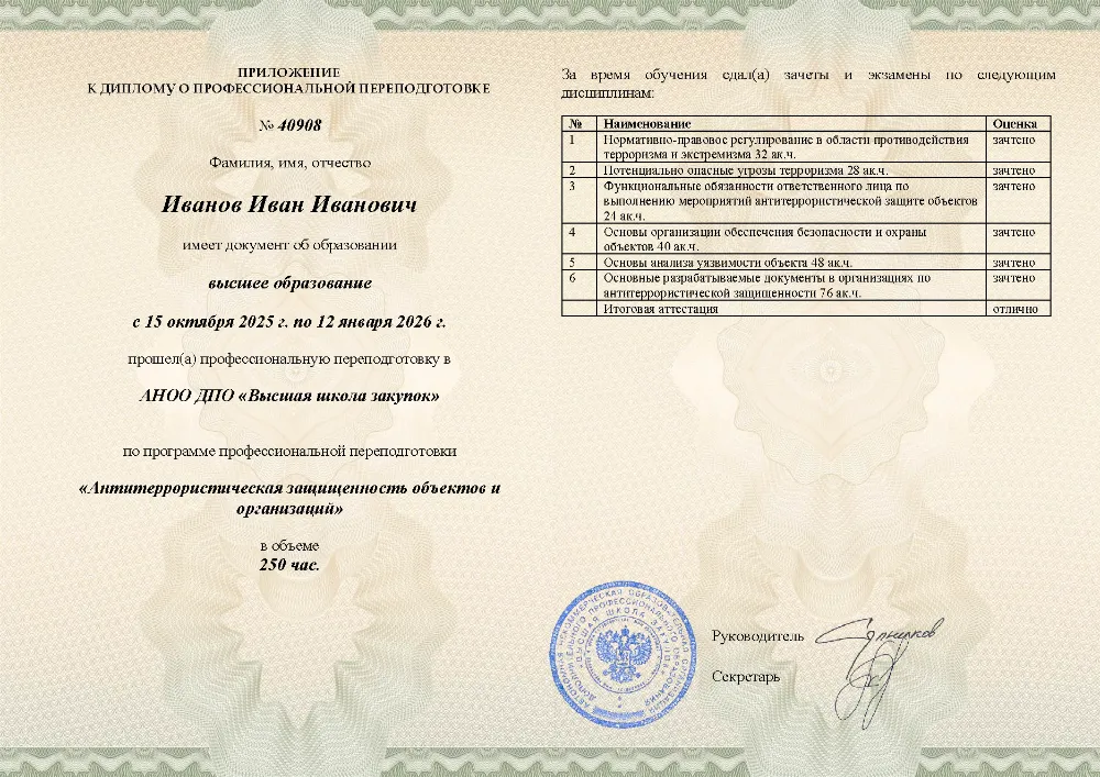 Профессиональная переподготовка, 250 академических часов, 6 модулей: нормативно-правовое регулирование и угрозы терроризма, функциональные обязанности ответственных лиц, основы безопасности и охраны объектов, анализ уязвимости и разработка необходимой документации. Онлайн-обучение в в Перми с итоговой аттестацией.