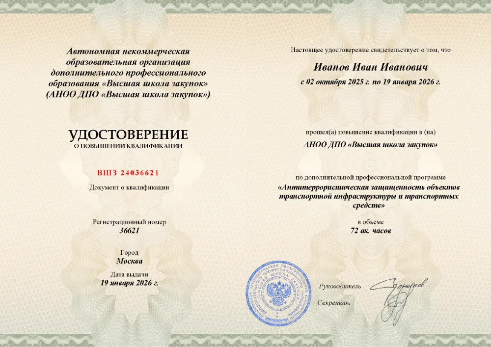 Повышение квалификации, 72 академических часов, 7 модулей: нормативно-правовые основы противодействия терроризму, анализ угроз и рисков, функциональные обязанности ответственных, инженерно-техническая укрепленность, документооборот и действия персонала при ЧС. Онлайн-обучение в в Перми с итоговой аттестацией.