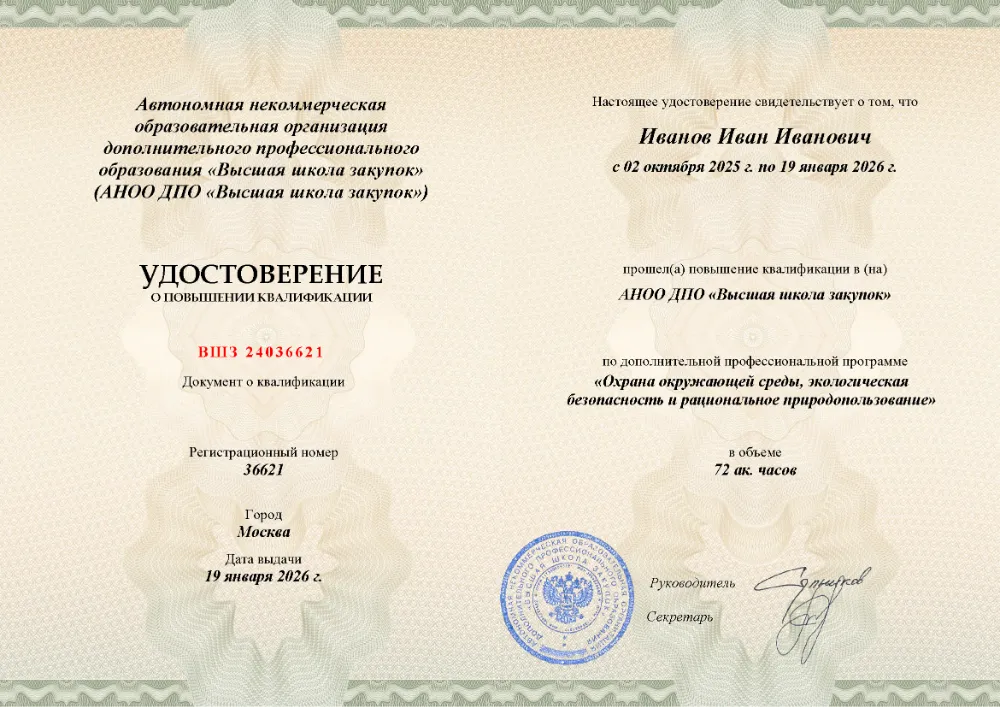 Повышение квалификации, 72 академических часа, 6 модулей: нормативно-правовые основы и государственное регулирование в сфере экологии, лицензирование деятельности, экологический надзор, ответственность за нарушения и рациональное природопользование. Онлайн-обучение в в Перми с итоговой аттестацией.