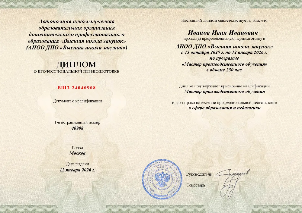 Это полноценная образовательная программа для получения дополнительной квалификации и освоения новой профессии. Для поступления также требуется высшее или среднее профессиональное образование (СПО). Итоговым документом является полноценный диплом о профессиональной переподготовке, который ценится на рынке труда. Программы являются наиболее объемными и начинаются от 250 академических часов, что обеспечивает глубокое погружение в специальность.