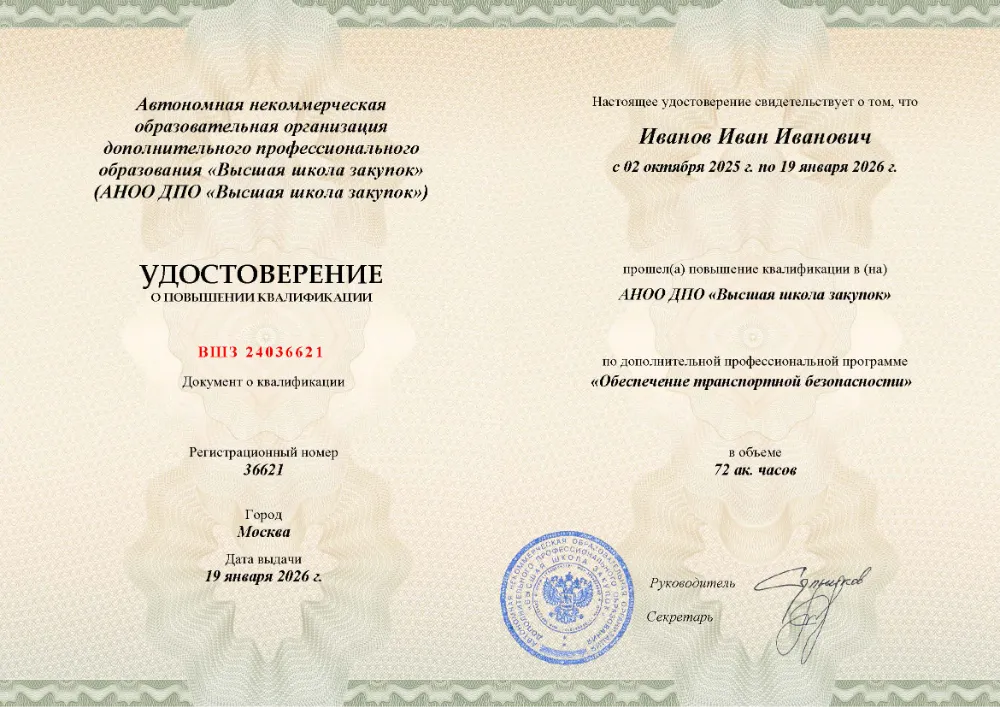 Повышение квалификации, 72 академических часа, 10 модулей: нормативная правовая база и система мер обеспечения транспортной безопасности, планирование и реализация защитных мероприятий, информационное обеспечение и государственный контроль, оценка состояния защищенности объектов. Онлайн-обучение в в Перми с итоговой аттестацией.